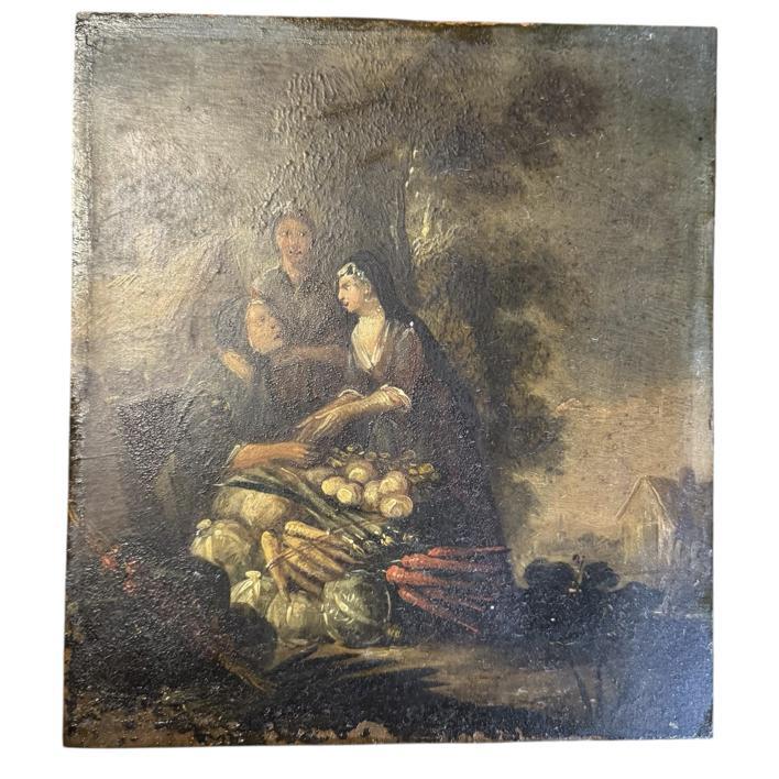 An early 19th century Dutch oil on copper panel scene of a market vegetable seller and customers, circa 1800