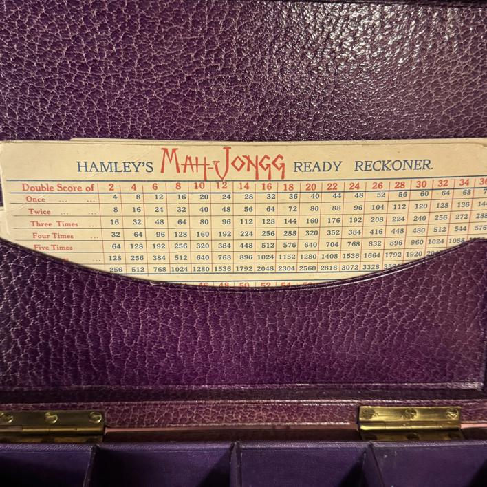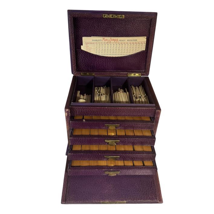 A fine Hamley's lilac leather cased mah-jong set wth carved bone and bamboo counters, circa 1920.