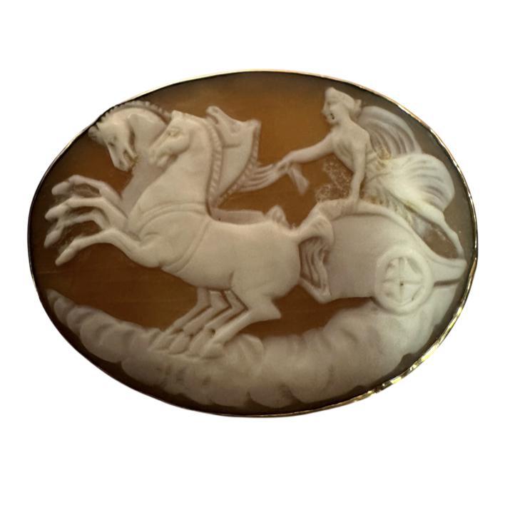 A late 19th century oval gold framed carved shell cameo brooch depicting a goddess in a chariot, circa 1890