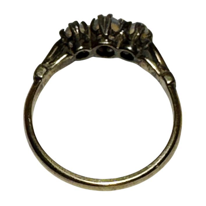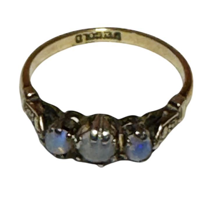Edwardian 9ct yellow gold three stone blue/black cabochon opal ring