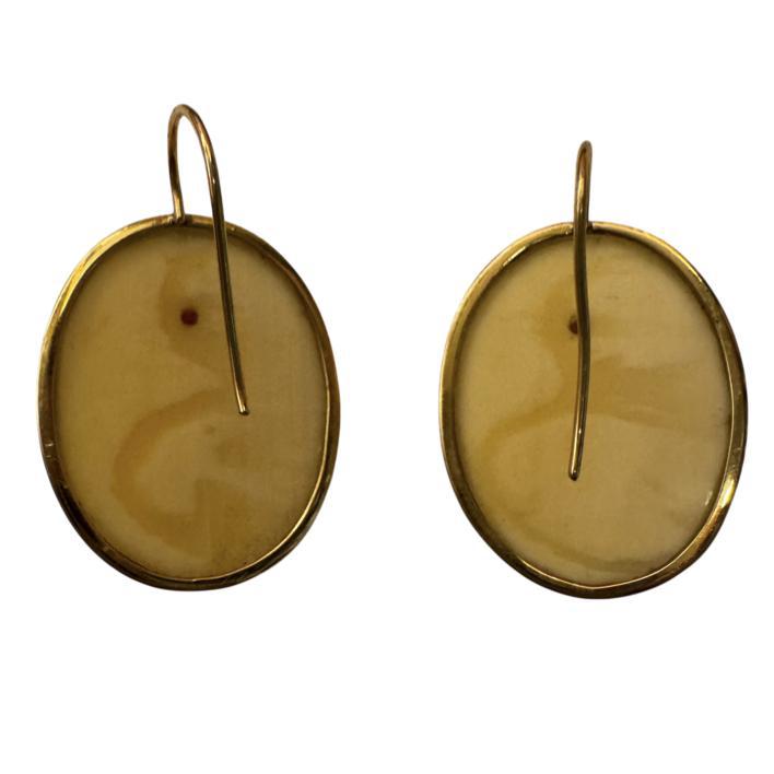 A pair of Regency carved cameo earrings in yellow gold frames, the cameos depicting country ladies. Circa 1810.