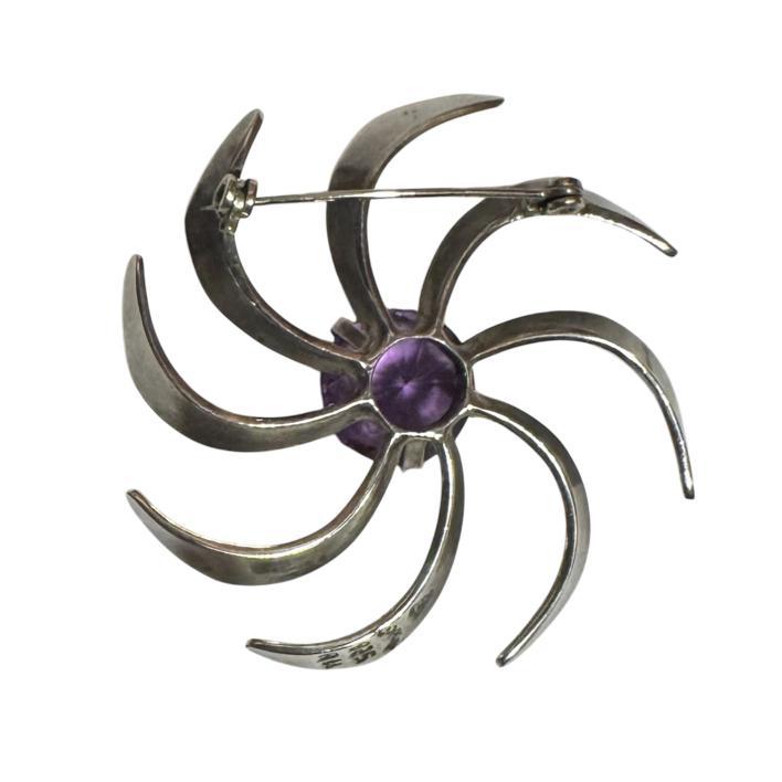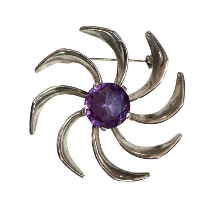 A retro Mexican Catherine wheel brooch with a large circular purple stone to the centre, circa 1960