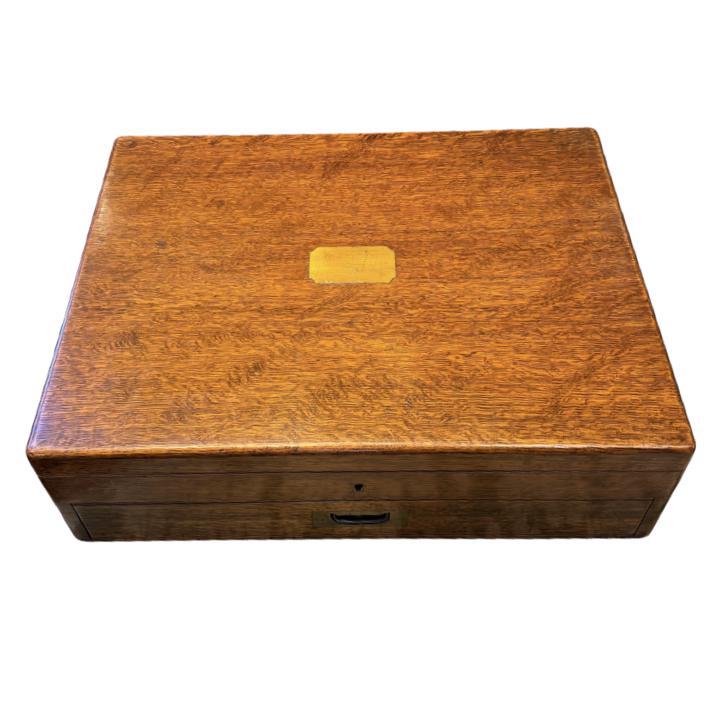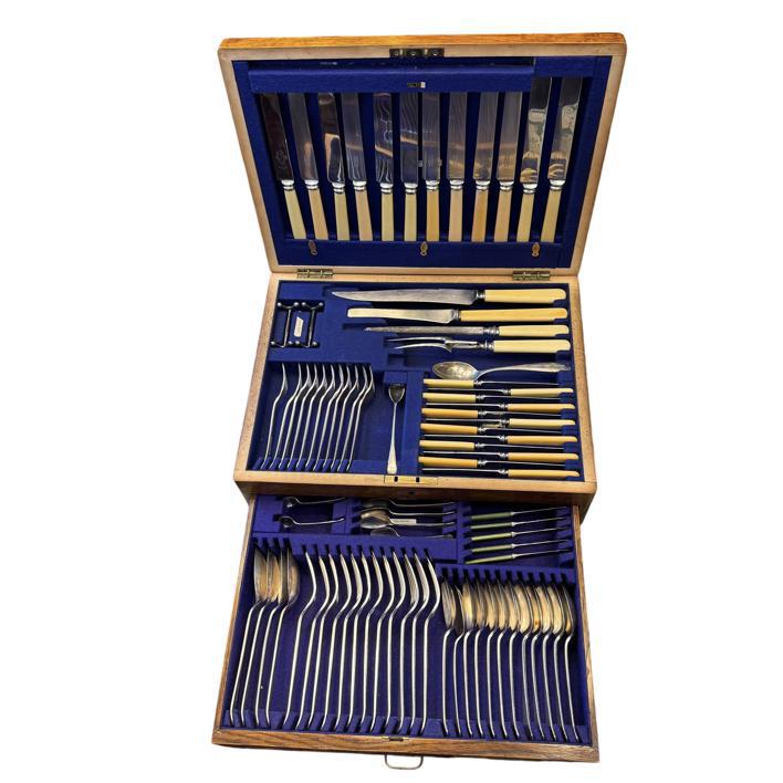 An Edwardian oak canteen of silver plate cutlery and knives, circa 1910.