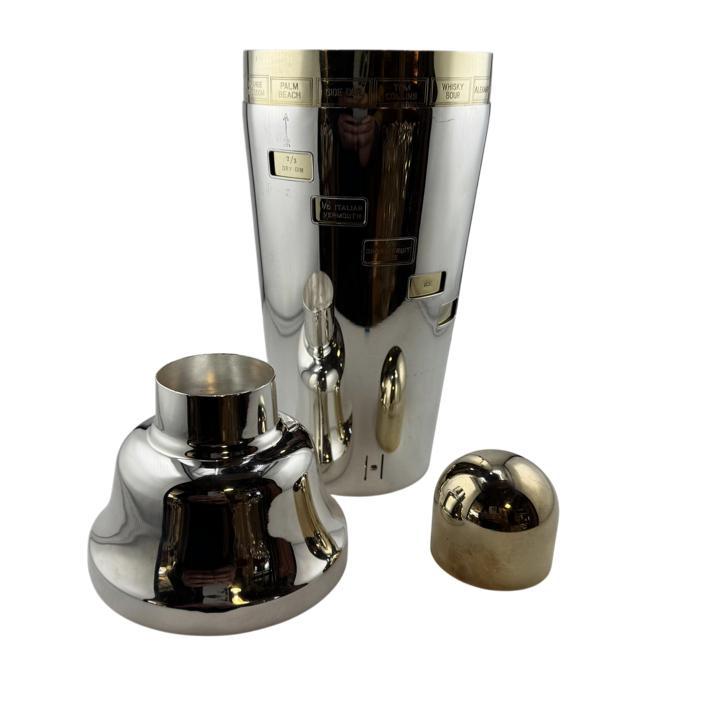 A rare 1930s American Napier patent large form silver plate and gilt recipe cocktail shaker.